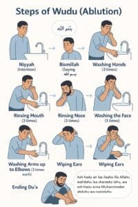 In this article, you’ll learn how to make Wudu step by step, with each action explained in detail along with relevant Qur’anic ayahs, Hadith, Arabic phrases, and a helpful summary table.